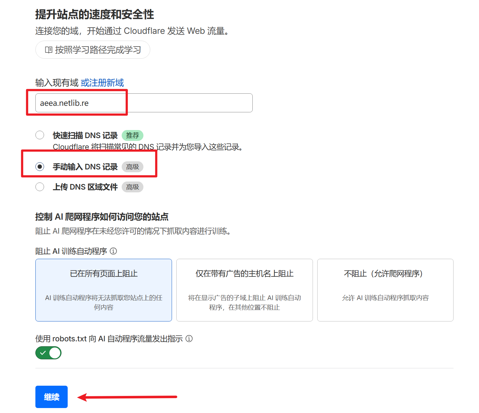 添加xxx.netlib.re域名,必须选择手动输入DNS记录,不要选择默认的快速扫描记录,这是成功的重点